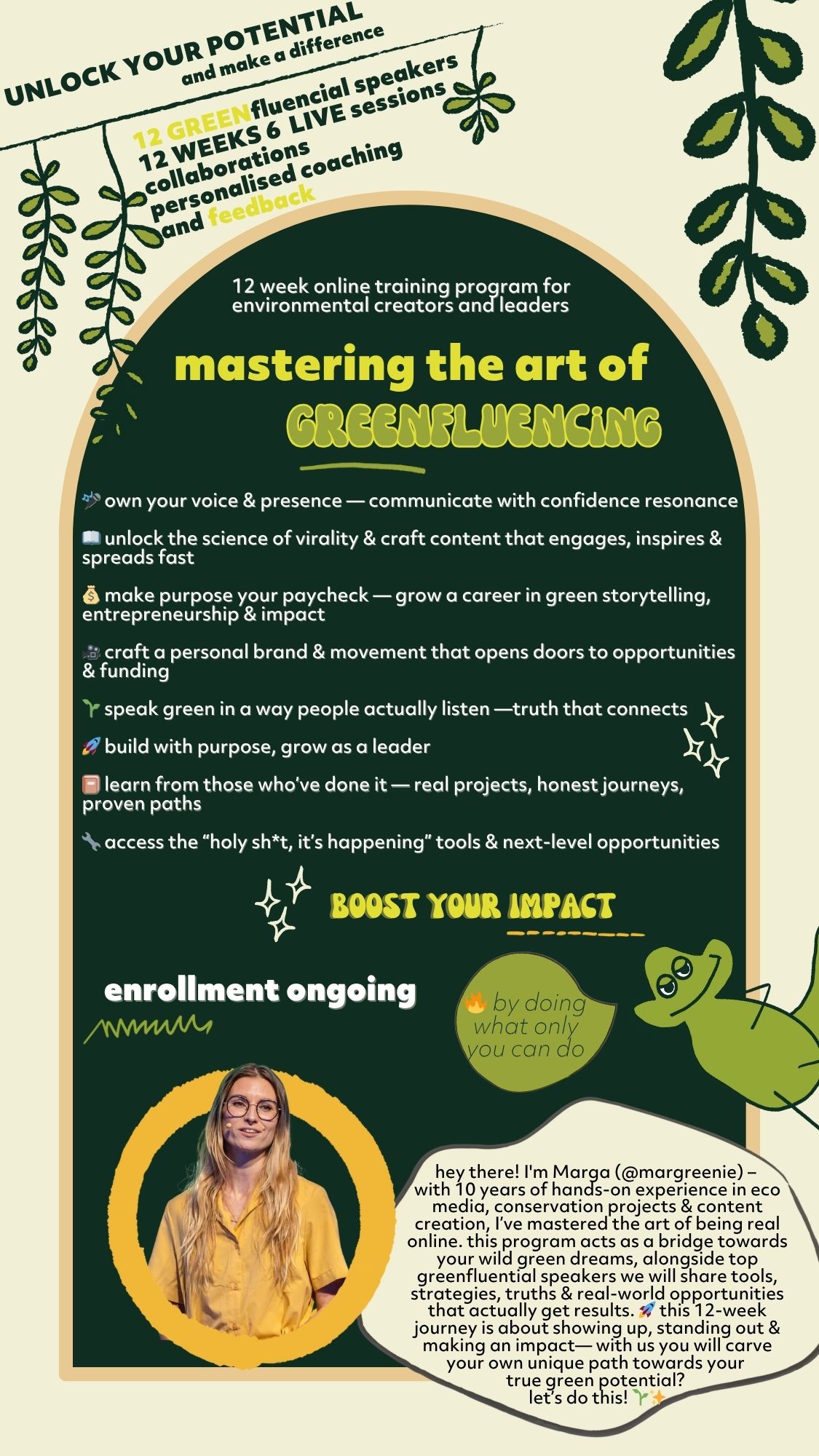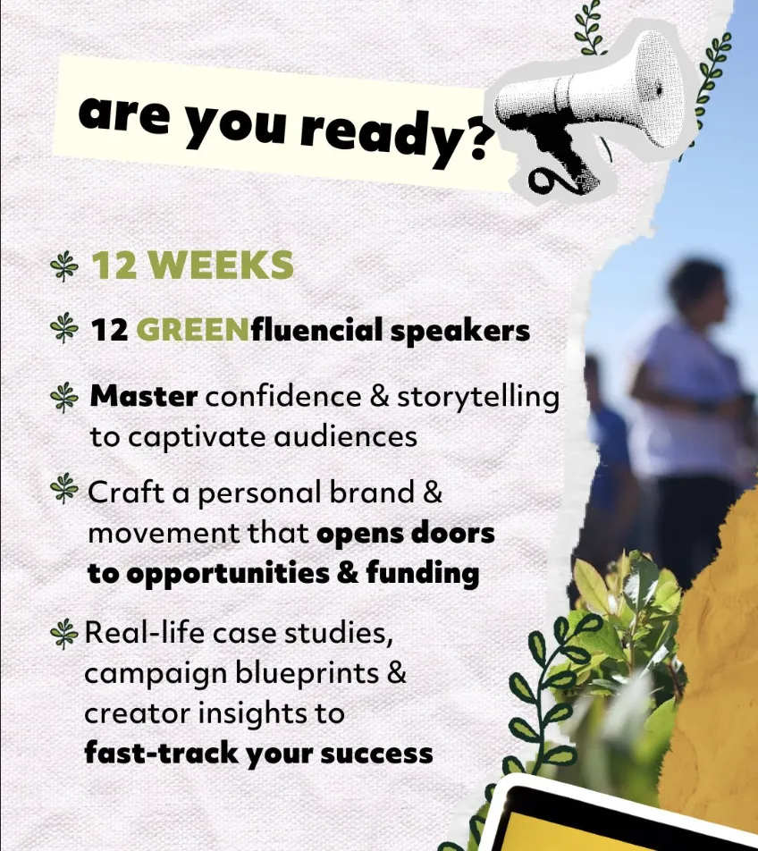 Mastering the Art of Greenfluencing is a 12-week program for environmental founders, sustainability startups, NGO leaders and purpose-driven creators who want to communicate with clarity, confidence and integrity — while building financially sustainable impact.